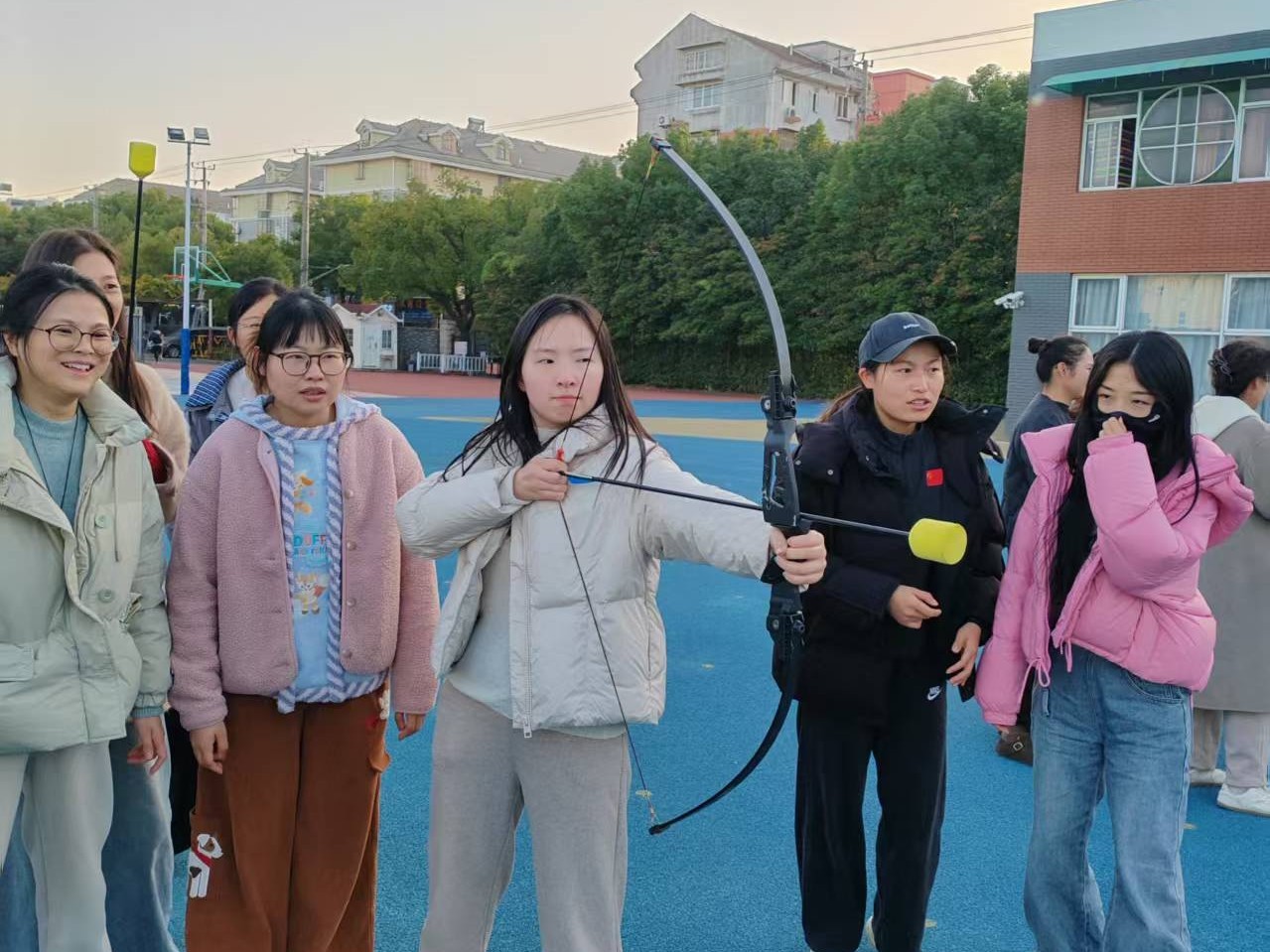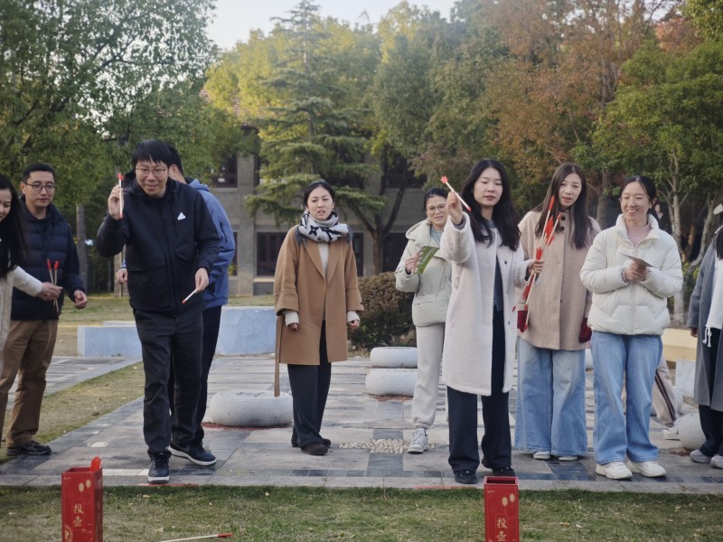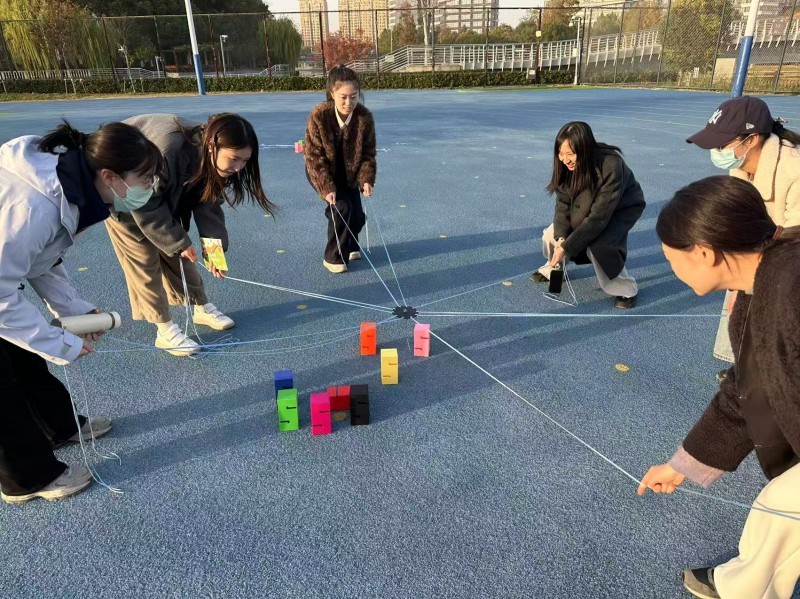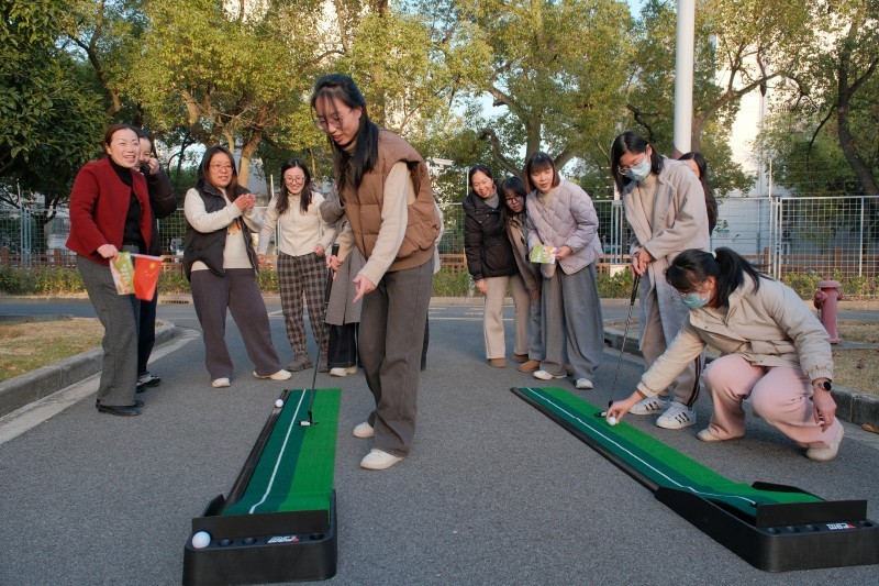 活动伊始,教职工们迅速响应 “6 人一组” 的组队要求,不少小组还即兴拟定了 “冲锋队”“阳光组” 等队名,现场氛围热烈而融洽。随着开赛指令下达,各小组立刻行动:有的围聚在地图前快速规划路线,有的一路小跑直奔首个任务点位。“合力筑塔”现场,组员们屈膝俯身,屏住呼吸,小心翼翼地递接积木,成功叠起 3 层塔时,大家齐声欢呼;“射箭” 点位前,教职工们站姿挺拔,眼神专注地瞄准靶心,每一次射中目标,同伴们都会送上热烈的掌声;“党建问答” 区域,大家围圈热议、各抒己见,遇到不确定的题目时相互提醒、补充思路,答对后的默契击掌更是彰显了团队温情;“投壶” 与 “迷你高尔夫” 区域更是笑声不断,瞄准箭矢投掷时,有人手一抖让箭偏离了壶口,笑着调侃 “手劲又没拿捏准”,挥杆打高尔夫时,偶尔出现的 “小失误” 也引来大家阵阵善意的笑声。各组在轻松愉悦的互动中默契配合,最终高效完成了所有闯关任务,每个人脸上都洋溢着尽兴的笑容。